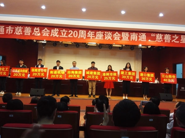 5月17日上午,慶祝南通市慈善總會成立20周年座談會暨南通“慈善之星”表彰會議在我市中華慈善博物館隆重舉行。江蘇省慈善總會會長蔣宏坤,中共南通市委書記陸志鵬,市委副書記、市長韓立明,市政協(xié)主席黃巍東等領(lǐng)導(dǎo)及市慈善總會歷任會長出席會議。 我公司應(yīng)邀參會并現(xiàn)場捐贈愛心款25萬元,以實際行動慶賀慈善總會成立20周年。