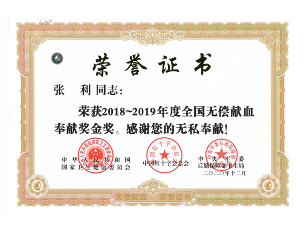 日前,我公司員工張利收到中華人民共和國國家衛(wèi)生健康委員會(huì)、中國紅十字會(huì)總會(huì)、中央軍委后勤保障部衛(wèi)生局三部門聯(lián)合頒發(fā)的“2018—2019年度全國無償獻(xiàn)血奉獻(xiàn)獎(jiǎng)金獎(jiǎng)”榮譽(yù)證書,這是我國給予無償獻(xiàn)血者的最高獎(jiǎng)勵(lì)。