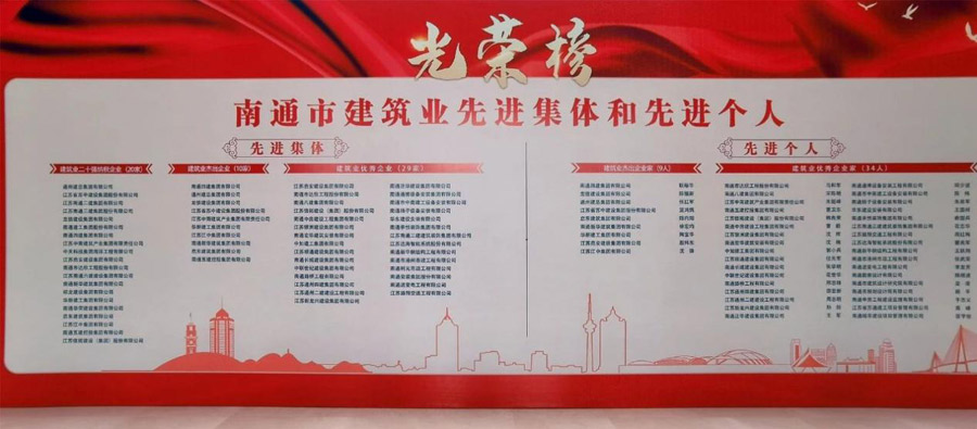 會議通報了《全市建筑業(yè)先進集體和先進個人名單》,我公司獲評“南通市建筑業(yè)優(yōu)秀企業(yè)”、董事長張武榮獲評“南通市建筑業(yè)優(yōu)秀企業(yè)家”光榮稱號。